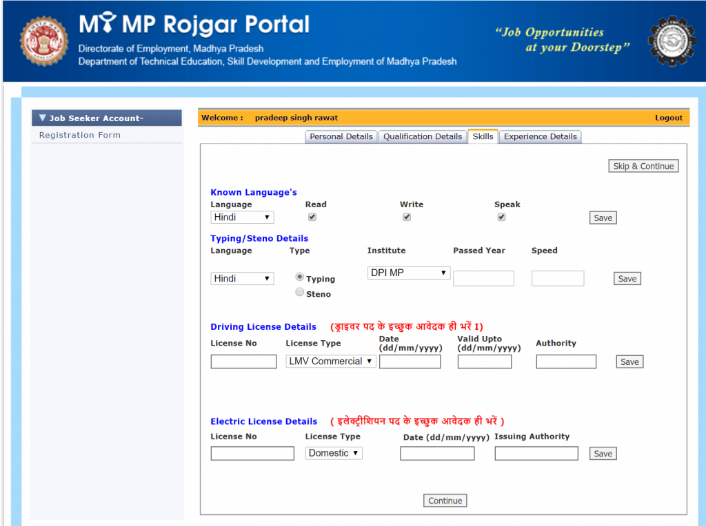MP रोजगर पोर्टल पंजीकरण विवरण